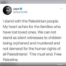 Zayn Malik, the famous English singer and celebrity, on May 14, 2021, expressed his support for the people of Palestine on his social media pages. He has over 40 million followers on Instagram and 30 million on Twitter; he posted on Instagram and Twitter, declaring his support for the oppressed people of Palestine and wrote: