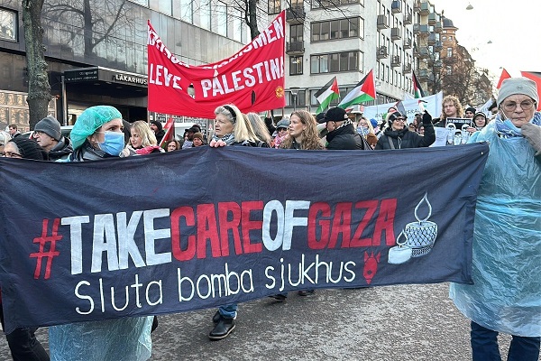 Following calls from numerous civil society organizations, the crowd gathered at Odenplan Square and marched to the Swedish Parliament, carrying banners reading “Israel is not complying with the ceasefire,” “Stop the genocide,” and “Palestine forever.”